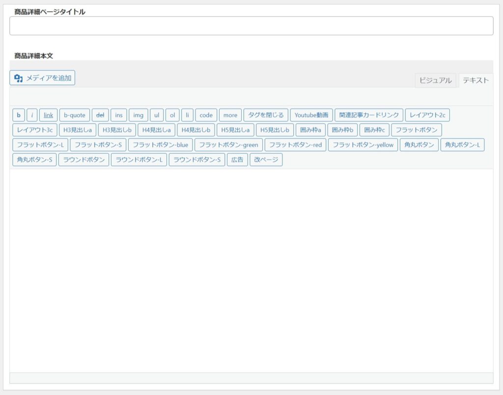 商品画像や記事内に挿入したい写真やイラストなどをアップロードする場合にこの「メディアを追加」を使用します。商品画像の登録方法はこちらをご覧ください。
